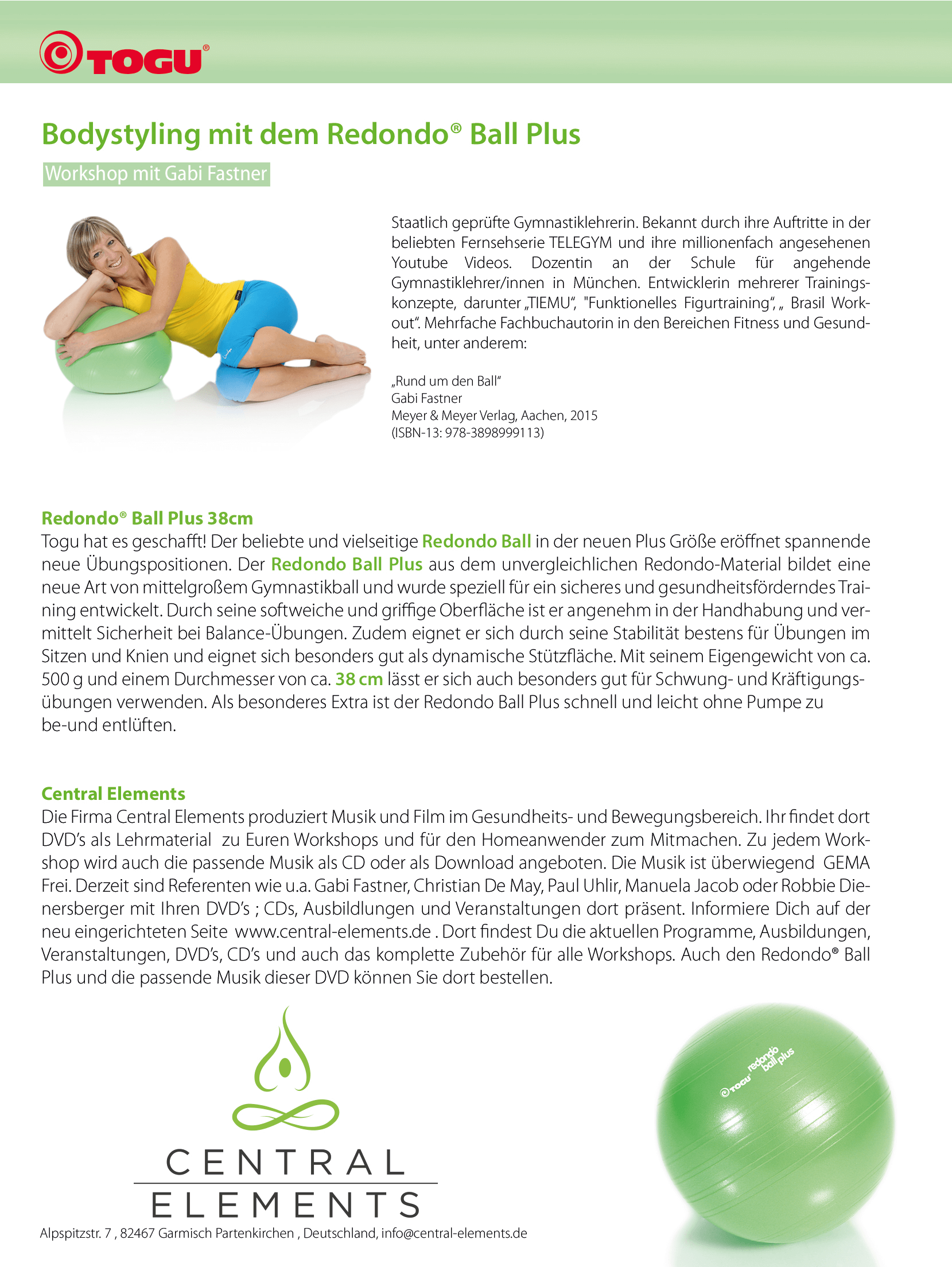 Gabi Fastner präsentiert Übungen rund um den Gymnastikball Redondo Ball Plus. Die DVD ist bestens geeignet für Trainer als Lehrvideo als auch als Home Trainingsvideo für alle, die sich selbst fit halten wollen.