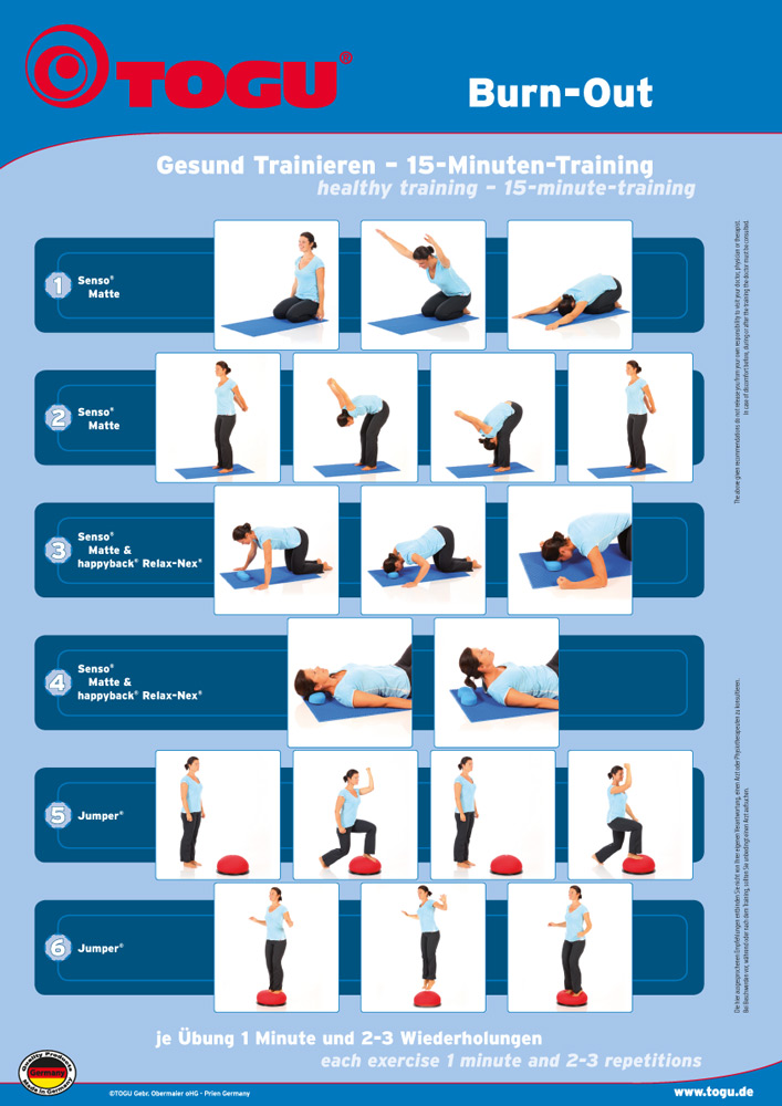 The burnout syndrome describes a state in which a person suffers from emotional exhaustion. If this condition becomes permanent, it can develop into serious psychosomatic illness or depression. The exhaustion is often triggered by overwork and stress and at the same time is becoming more and more intense. Regular stress reduction is the key to more serenity, well-being and a balanced life. Movement can be a method or part of a method to break the vicious circle of stress, overload and exhaustion.