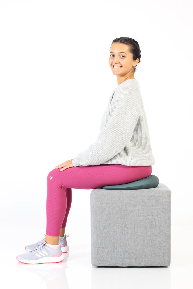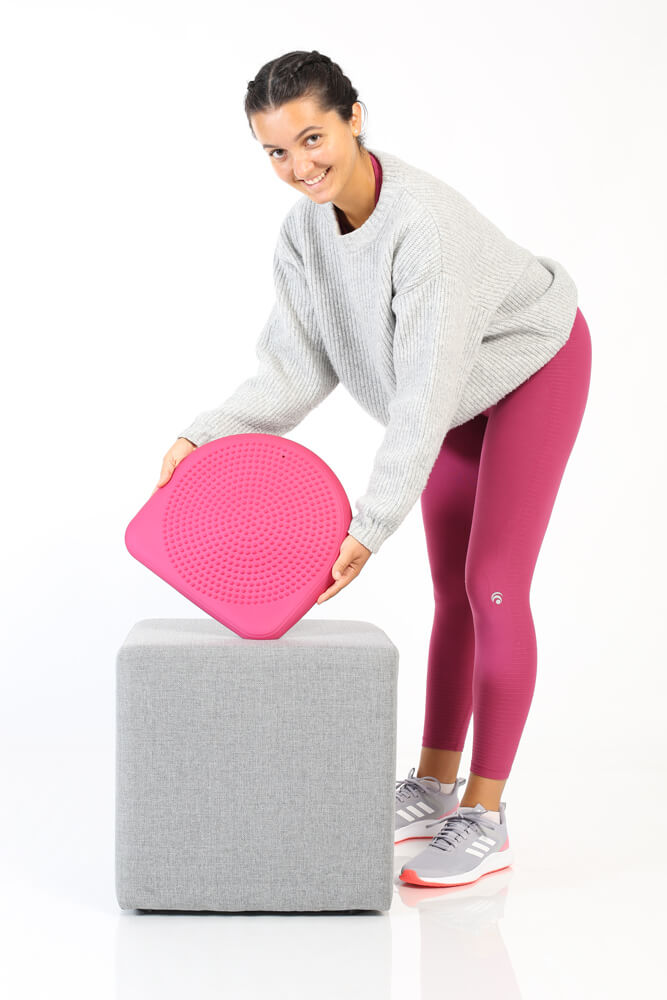 The seat cushion is perfect because it is saving a lot of space compared to a ball. It makes me sit more upright due to the wedge like shape. At the same time it makes me sit comfortably as it offers more stability thanks to its design. Still the air inside requires some counterbalancing which strenghtens my back muscles. You get used to it quickly and just after a short while you realize: There is something happening with my body! I sit more upright, I compensate permanently in order to keep balance and I feel my back muscles working. As my back pain gradually disappears, my impression of doing something good for my health is reaffirmed.