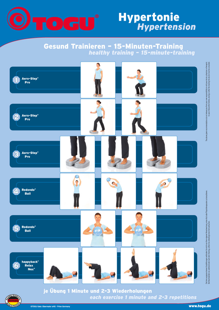 The 15-minute exercise programme for this indication includes suitable exercises which can be carried out in consultation with your doctor. It can be accessed online here free of charge and is easy to integrate into your everyday life. It is also suitable for untrained persons. The special TOGU Hypertension Set motivates additionally to the training. The air-filled training devices are also ideal for use in a group.