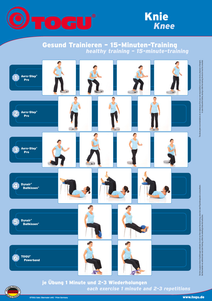 The 15-minute knee program developed by the team doctor of the German national snowboarding team Dr. Sommer, which you can download here free of charge online and easily integrate into your everyday life, contains such exercises. It can also be carried out by untrained persons. By using the TOGU knee equipment set, which is adapted to this program, the training stimuli are even more intensive. Further articles, which you find in this category, are also suitable for the application in this area.