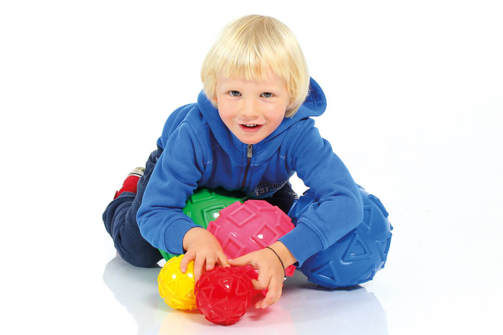 The new fun and learning ball for kindergarten and leisure - now also available in 9 cm diameter! The different geometric figures (circles, triangles and squares) and bright colours promote perception, concentration and coordination. Due to the different shapes ideal to grasp. In two sizes and 4 colours.