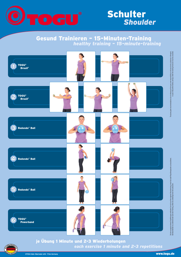 Das vom Teamarzt der deutschen Snowboard-Nationalmannschaft Dr. Sommer entwickelte 15-minütige Programm, das Sie hier kostenlos online abrufen und einfach in Ihren Alltag einbauen können, beinhaltet solche Übungen. Es ist auch für Untrainierte durchführbar. Durch den Einsatz des darauf abgestimmten TOGU Schulter Geräte-Sets werden die Trainingsreize noch intensiviert. Weitere Artikel, die Sie in dieser Kategorie finden, sind ebenso geeignet für die Anwendung in diesem Bereich.