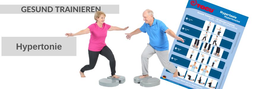Inhalt: - Aero-Step Pro silber - happyback Relax-Nex blau - Redondo Ball 22 cm- Trainingschart Hypertonie Empfohlene Bewegungsprogramme und Trainingsgeräte bei arterieller Hypertonie Beim Krankheitsbild der arteriellen Hypertonie, oft verkürzt auch nur Hypertonie oder Bluthochdruck genannt, ist der Blutdruck des arteriellen Gefäßsystems chronisch also längerfristig erhöht. Vorübergehende und kurzfristige Blutdruckerhöhungen z.B. durch Erkrankung oder auf Grund der Einnahme von Medikamenten werden nicht als Hypertonie bezeichnet. Das 15-minütige Bewegungsprogramm zu dieser Indikation beinhaltet passende Übungen, die in Absprache mit Ihrem Arzt ausgeführt werden können. Es ist für Sie hier kostenlos online abrufbar und einfach in Ihren Alltag einzubauen. Es ist auch für Untrainierte geeignet. Das spezielle TOGU Hypertonie-Set motiviert zusätzlich zum Training. Ideal sind die luftgefüllten Trainingsgeräte auch für die Anwendung in der Gruppe. Dr. med. Gerrit Sommer: „Das Geniale am Gesund Trainieren-Konzept ist die optimale Kombination aus perfekten Trainingsgeräten und einfacher Umsetzbarkeit für den Patienten. Dies wird ergänzt durch eine einzigartige Übungskombination, die auf die spezifische Krankheit, Verletzung oder den Wunsch der Gewichtsreduktion zugeschnitten ist. So ist ein Training für Jung bis Alt möglich.“ Egal ob Sie das Programm zur Prävention einsetzen oder erst nach dem Auftreten eines gesundheitlichen Problems aktiv werden: Bei Beschwerden fragen Sie bitte immer Ihren Arzt oder Physiotherapeuten um Rat. Gesund Trainieren bietet Ihnen eine Lösung, die Sie eigenverantwortlich im Alltag als Ergänzung zur therapeutischen Behandlung durchführen können. - made in Germany -