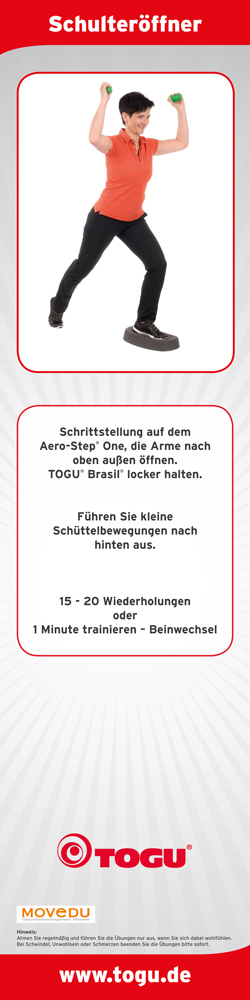 Ein Baustein bildet dieses TOGU Set, das von movedu - Beate Missalek für Aktivierungseinheiten und bewegte Pausen am Arbeitsplatz entwickelt wurde. Weitere Verwendungsmöglichkeiten sind Trainingsflächen in Bewegungszentren, Fitnessstudios und Vereinsräumen. Die Teilnehmer können so schnell, einfach und dabei effektiv in Bewegung gebracht werden.